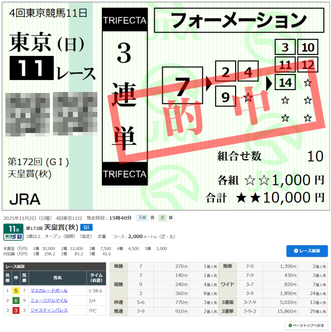 【第172回天皇賞(秋) 2025】歳馬マスカレードボールが差し切りGI初V!